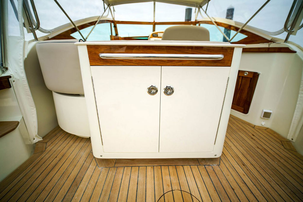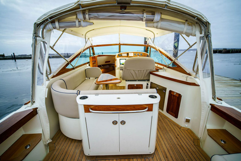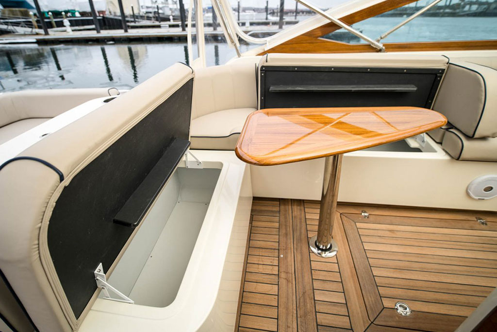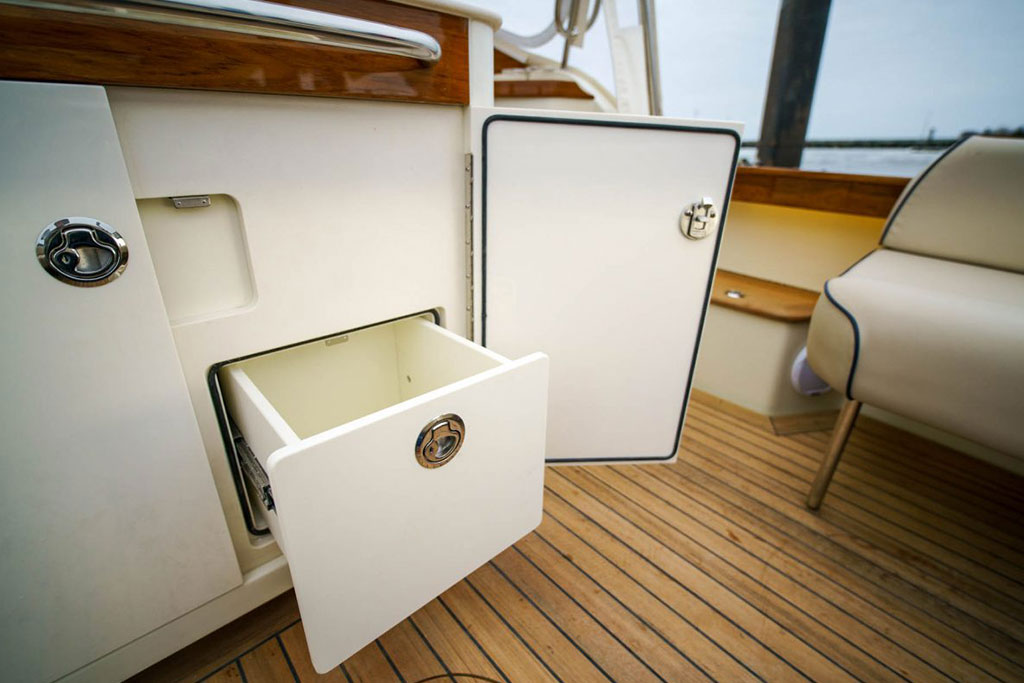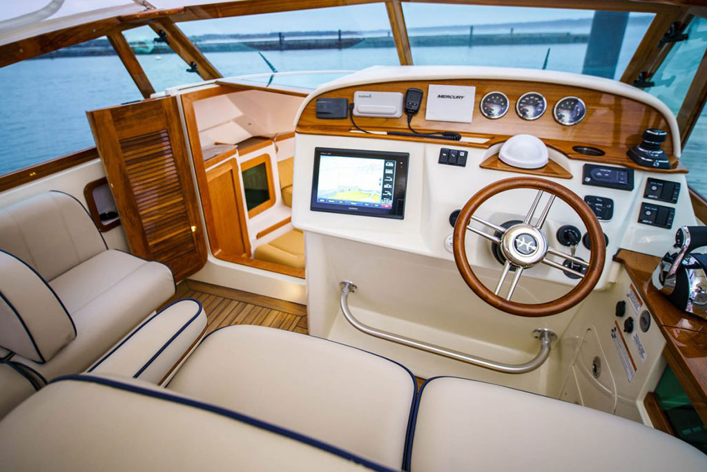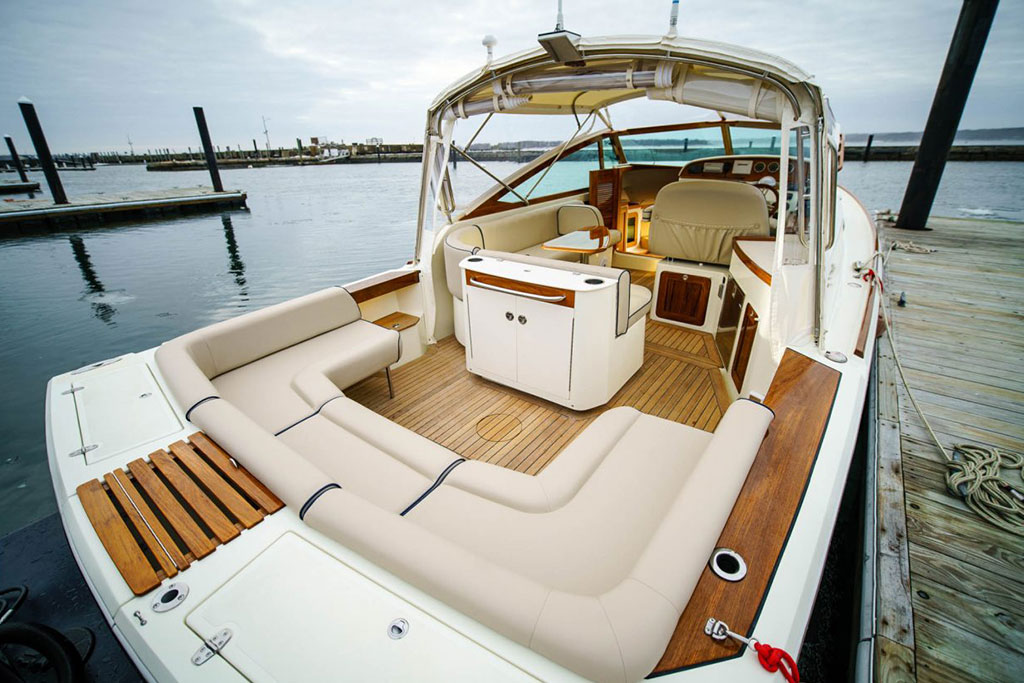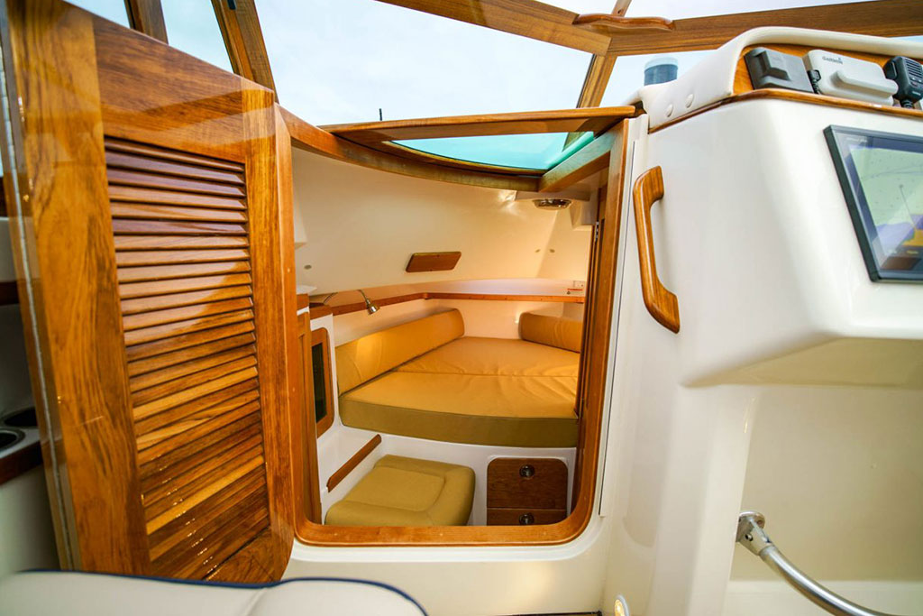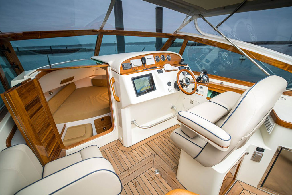The signature Hunt Deep-V hull navigates choppy waters with ease, while twin outboard engines deliver speeds up to 44 knots. The Harrier 32 also boasts a comfy interior complete with roomy storage lockers and an enclosed head with a shower. Other convenient touches include a well-situated on-deck galley and a spacious cockpit with easy access to controls and electronics.