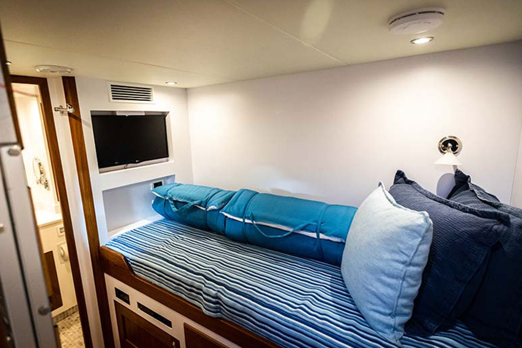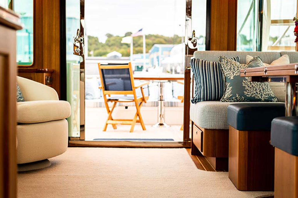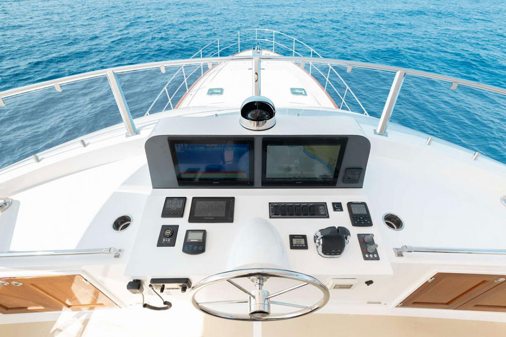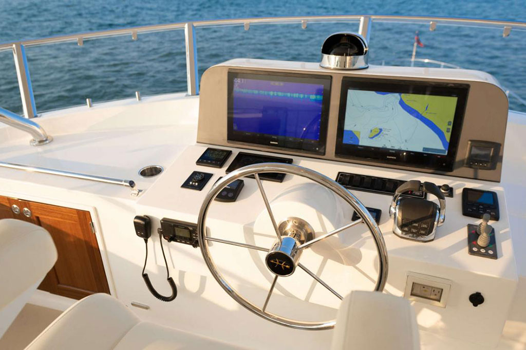Boasting twin 1,000 hp outboard engines with a top speed of 31 knots, the Hunt Ocean 63 delivers exceptional mileage, range, and durability. A Deep-V hull with a patented 20-degree deadrise ensures smooth sailing in still waters and choppy seas, while the upper helm features two convenient chartplotters to monitor your course, location, and speed.